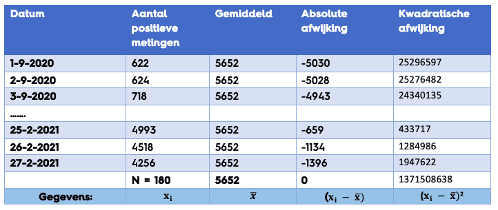 We zien in dit voorbeeld dat de variantie groot is. Als alle cijfers hetzelfde zouden zijn zou de variantie 0 zijn en er dus weinig variatie zitten in het aantal besmettingen.